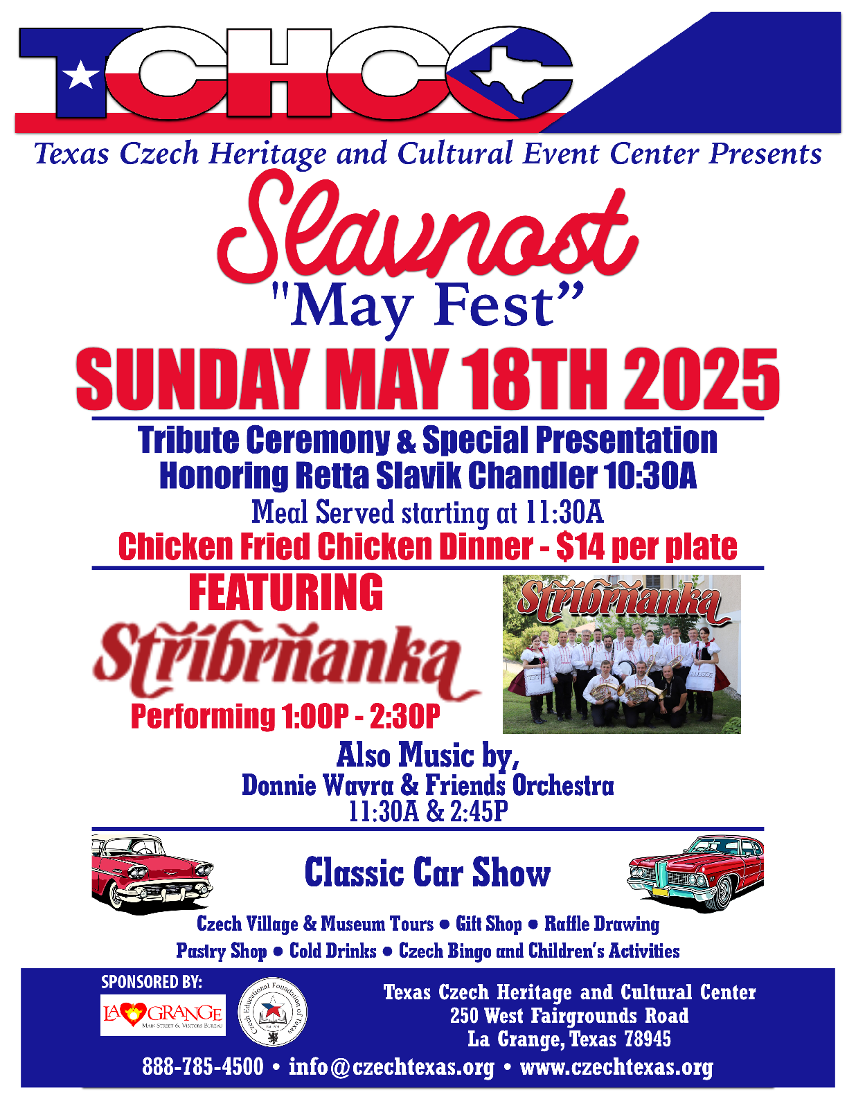 May 18, 2025. Slavnost ‘May Fest’ & Tribute to the Czech Immigrants to Texas. Tribute to the Czech Immigrants to Texas Ceremony at 10:30A with additional festivities all day until 2pm.